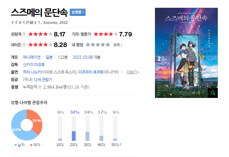 주말 오후에 예매를 해서 그런지 관람객이 꽤나 많았어요. 오늘 기준 누적 관람객수가 300만명이 조금 안되고 있습니다. 더 퍼스트 슬램덩크에 이어 스즈메의 문단속도 사람들이 많이 보고 있네요. 일본 애니메이션은 완성도가 높기 때문에 극장에서 볼 만 하다고 생각됩니다.