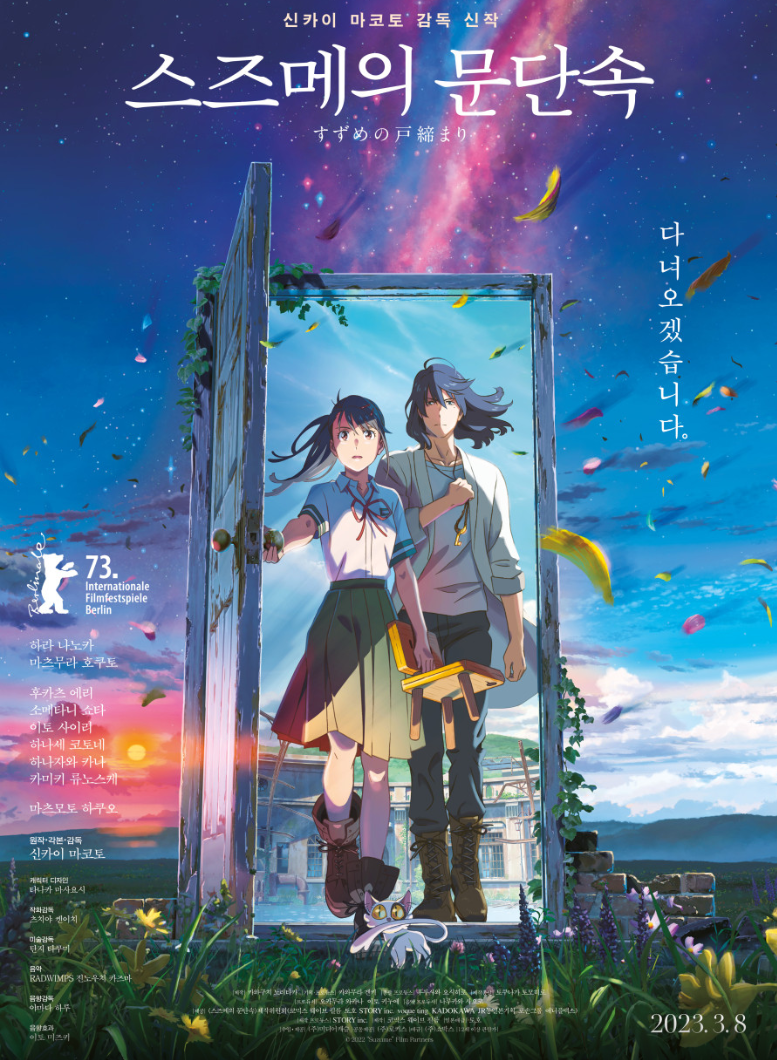 스즈메의 문단속은 고등학생 소녀 '스즈메'와 문을 찾아 여행 중인 청년 '소타'가 함께 재앙 '미미즈(재앙을 일으키는 존재)' 를 봉인하기 위해 규슈, 시코쿠, 고베, 도쿄 등 일본 곳곳에 있는 폐허의 '문'을 찾아다니는 이야기입니다. 신카이 감독은 이 영화에 나오는 '문'의 아이디어를 드라마 도깨비에서 얻었다고 합니다. 문을 열면 전혀 다른 새로운 세계가 펼쳐진다는 점에서 드라마 도깨비와 닮아 있네요.