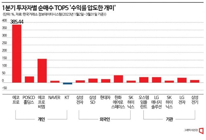 - 개미들이 1兆를 사들인 가운데 1분기 수익률이 385%로 외국인과 기관을 압승할 것으로 보입니다.