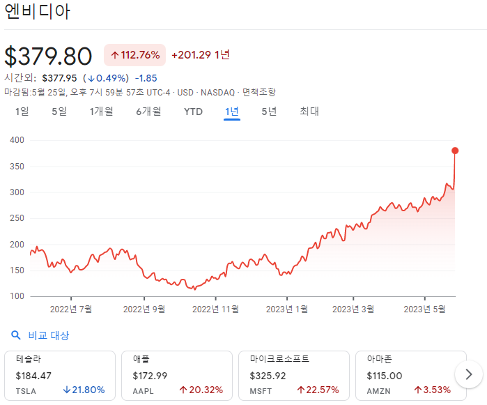 2023년 OpenAI - 마이크로소프트와 구글의 생성형 인공지능 전쟁으로 인하여 엔비디아가 간접적인 수혜를 입었으며, 5월 실적 발표에서는 압도적인 2분기 가이던스를 전망하는 등 어닝 서프라이즈를 일으키며 하루 만에 주가가 25%가량 폭등하여 아마존의 시가총액 규모를 넘보고 있는 상황입니다.